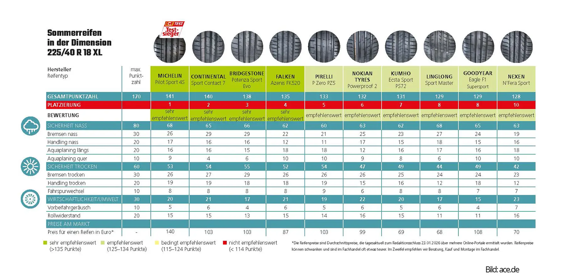 Dahinter folgen Continental (140 Punkte), Bridgestone (138 Punkte) sowie Falken (135 Punkte) – ebenfalls „sehr empfehlenswert“.