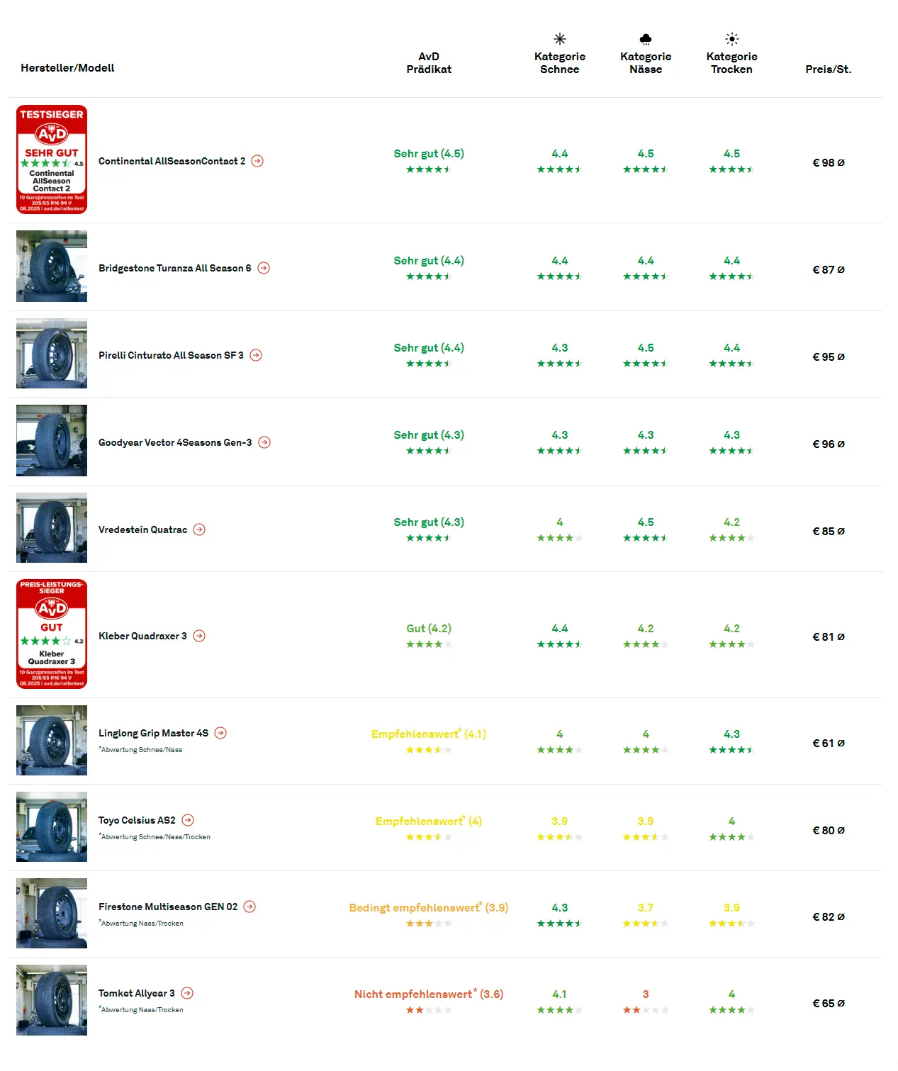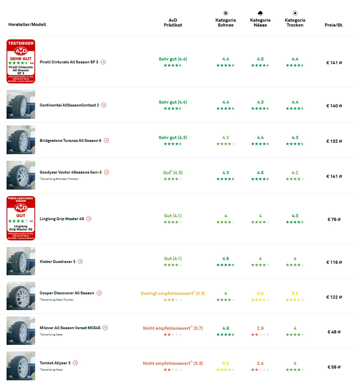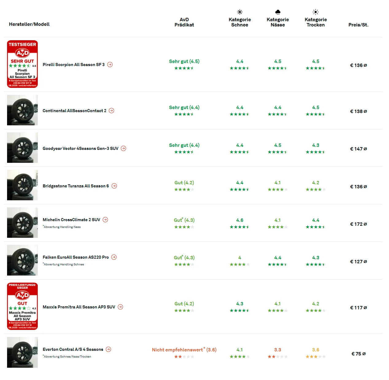 Highlights: Testsieger Pirelli Scorpion All Season SF 3 (~4,5; exzellentes Bremsen, Top-Handling). Sehr gut: Continental AllSeasonContact 2, Goodyear Vector 4Seasons Gen-3 SUV. Dahinter: Bridgestone Turanza All Season 6 vor Michelin CrossClimate 2 SUV (bei Nässe-Handling leicht schwächer). Preis/Leistung: Maxxis Premitra All Season AP3 SUV. Nicht empfohlen: Everton Contral A/S 4 Seasons.